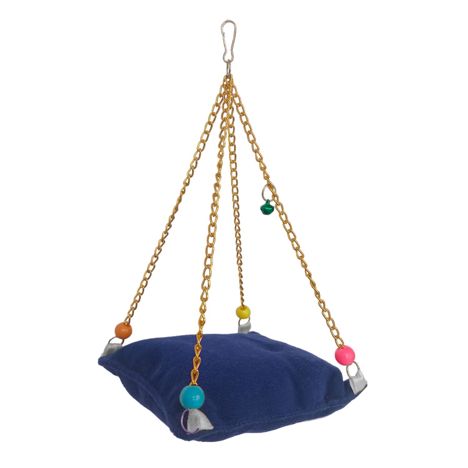 Çanlı ve minderli kuş salıncağıdır. Salıncağın ortasında askılı bir peluş minder bulunmaktadır. Renkli çan ve boncuklarla hazırlanan askısı ile şık bir görünüme sahiptir. Kuşlarınız bu oyuncaklarla hoş bir vakit geçirebilirler. Çanlı kuş hamağı sallanan minder tasarımı sayesinde kanatlı dostunuz için özel olarak üretilmiştir. Oyuncaklar zihinsel egzersiz oluşturması açısından yararli olup fiziksel egzersize teşvik eder. Farklı oyuncaklar kullanmak kuşun ilgisinin çeker, bu sebeple dönem dönem oyuncak değişikliği yapılması kanatlı dostunuzun sıkılmasını ve bunalıma girmesini önleyecektir.
